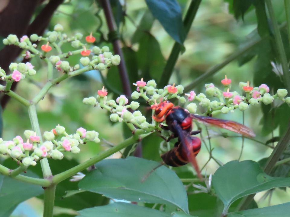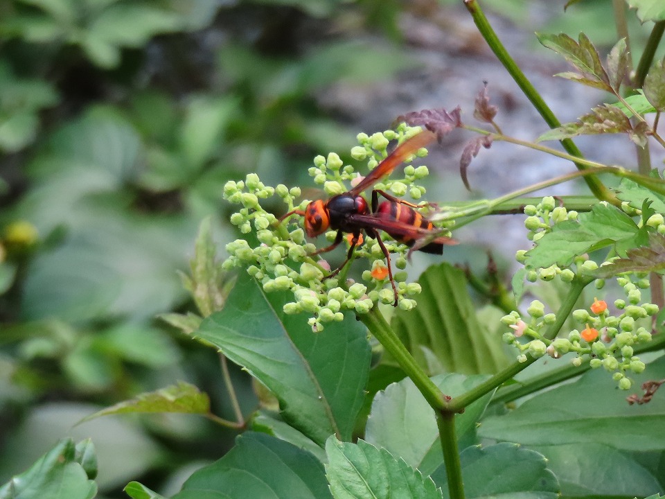 森林館から旧校庭後に至る通路の草花にもスズメバチが飛んできています。