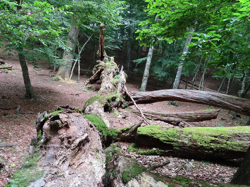 作業道も一般の登山道ではありませんので、最低限、ルートファインディングが出来る登山レベル、上りと下りとも3点支持が確実に出来ないと危険なほど荒廃しています。